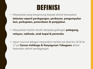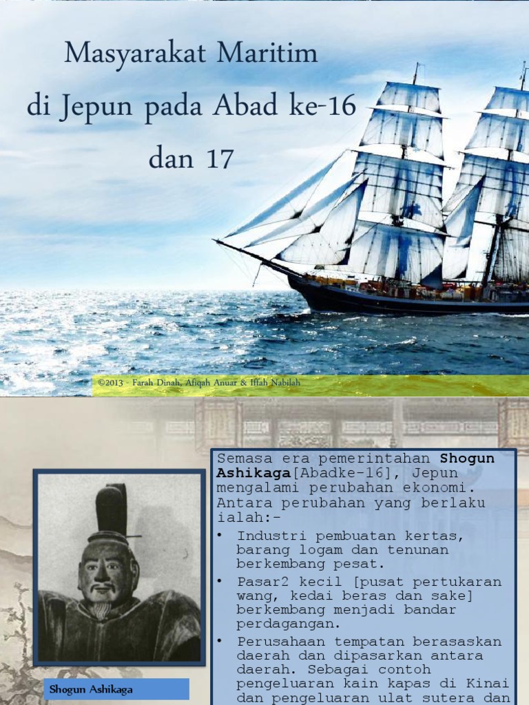 Agensi Penguatkuasaan Maritim Malaysia atau Maritim Malaysia dan APMM secara rasmi untuk pengecaman antarabangsa ia dipanggil Pengawal Perairan Malaysia merupakan agensi kerajaan yang bertanggungjawab mengawasi setiap kawasan perairan di Malaysia agar aman dan selamat bagi kegunaan masyarakat dan negaraSelain dari itu tugasan penting Maritim. Sejarah stpm sem 1 - masyarakat maritim di jepun abad ke 1617 saadiah alidrus. Masyarakat maritim di Jepun terdiri daripada golongan pedagang nelayan nakhoda anak kapal dan peneroka.